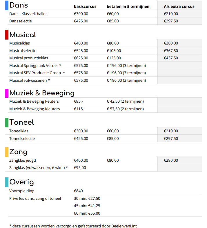 Er zijn bijkomende kosten in de vorm van kaartjes die u kunt kopen als u de eindvoorstelling wilt bijwonen. Afhankelijk van het theater waar de voorstelling wordt gepresenteerd, worden de kosten van een kaartje bepaald. Verder kunt u denken aan kosten voor de aanschaf van bijvoorbeeld geschikte kleding of lesmateriaal.